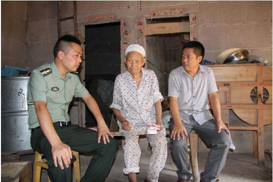 图为镇人大副主席汪兴海(右)与人武部工作人员在该镇水口村慰问在乡老复员军人龚传文。(苏昆仑摄)