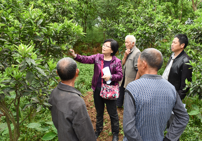 5月5日,市人大代表、垫江县农技站农业技术推广研究员黄丕娇(左二),在高峰镇大井村现场指导村民柑橘病虫防治。她认真履职,提出的有关农业技术推广、土地资源持续利用、农民生产积极性保护和农民增收致富等方面建议均得到政府重视并办理,协调解决了许多农民群众的实际问题。 (杨波 摄)
